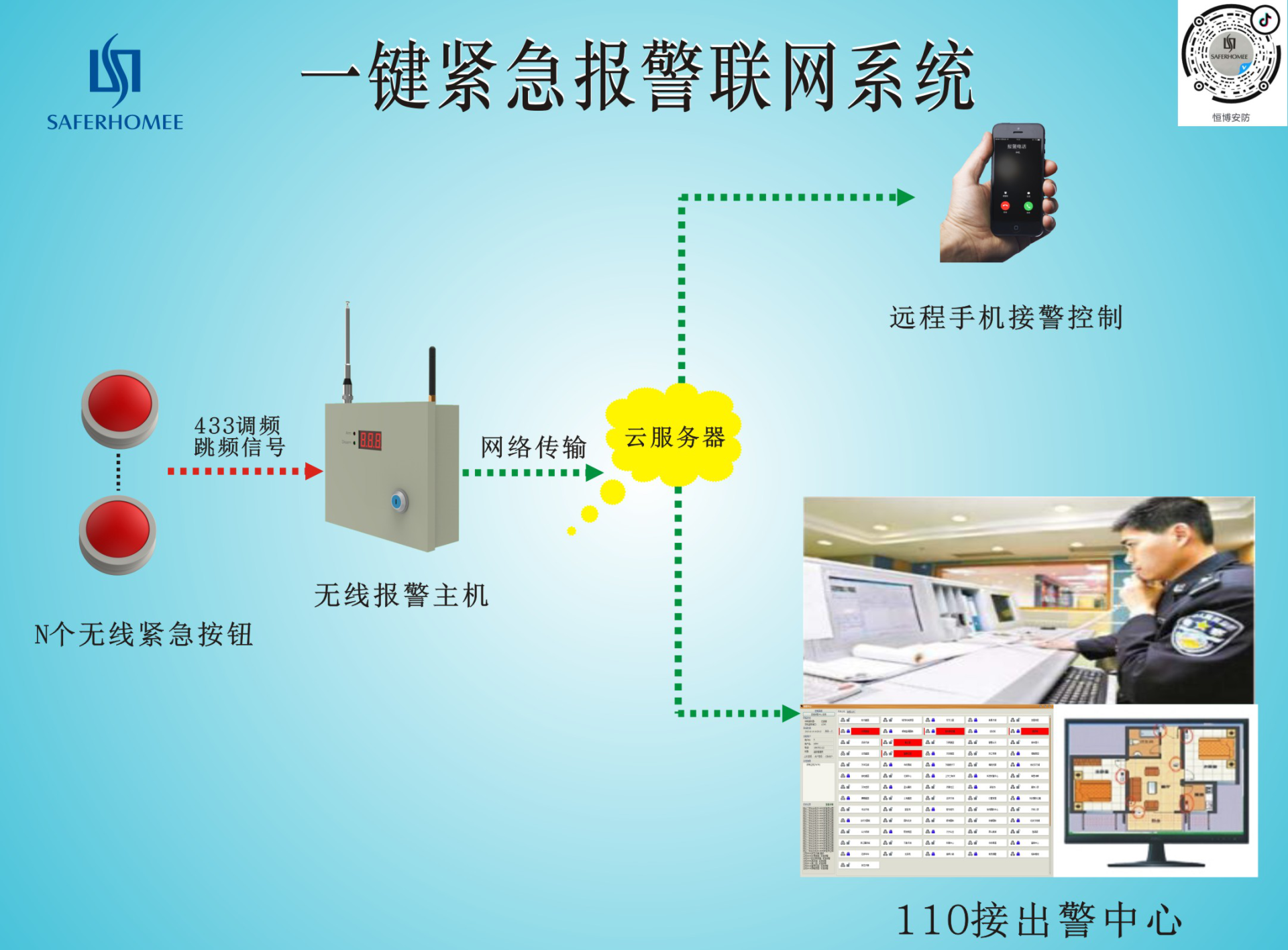 本項目為一個部隊崗哨一鍵式報警項目,是地處在一個區域范圍內;需要一點觸發多點報警,推薦每個崗哨安裝幾個一鍵式緊急報警按鈕和一臺報警主機。崗哨的緊急按鈕和每一臺報警主機都學好碼,因為考慮到崗哨和崗哨之間分布的比較遠,增加信號轉發器來增加接收距離,一個轉發器可以轉發兩公里左右,最多可以四級轉發。該產品不僅供電無線,信號傳輸亦無線,方便安裝維護,而且本端均采用調頻加跳頻技術,提供可靠的抗干擾性能,后端采用的無線報警主機則用兼容性較強的“工程報警主機(HB-G250)”來進行集中管理。以后可以根據需求,增加聯動模塊就可實現和監控聯動,當遇到有入侵者來犯,馬上響響報警聲,同時信號推送到后臺主機,信號通過聯動模塊帶動攝像頭,第一時間把現場情況及入侵者外貌拍錄下來,是他無處遁形。我們將對所涉及產品分別進行敘述: