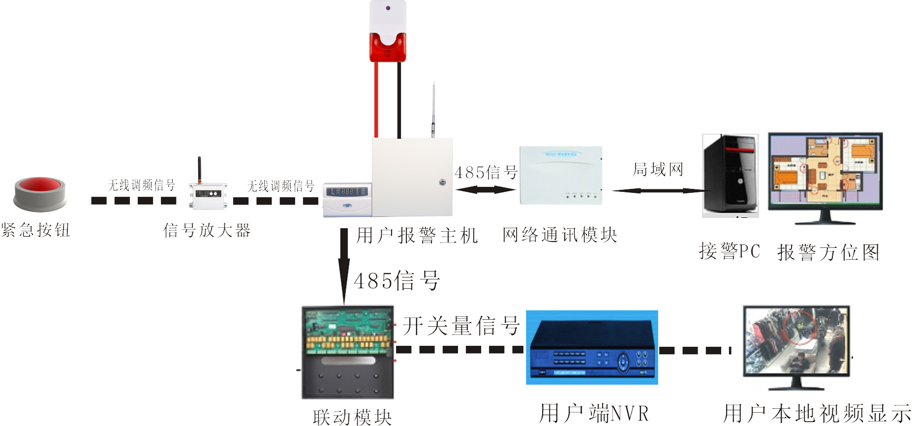 該系統無需挖溝,避免了常規有線報警系統常遇到的線路老化、線路易被嚙齒類動物破壞、易遭雷擊、售后維護復雜等問題。報警主機通過外接聯動模塊后,還可以實現與現有的監控系統進行視頻報警聯動。當某防區報警時,一鍵緊急按鈕發送無線信號至報警主機,主機發出現場報警,并且通過485信號傳輸至聯動模塊,轉換成開關量信號與監控系統對接,實現實時調取該防區視頻信號。避免了原有監控系統需要人工輪巡的缺點。該系統后期可增加太陽能紅外對射式電子圍欄、無線紅外探測器等等設備,實現其他的更多防范功能,從而真正組成一整套安防智能化系統。