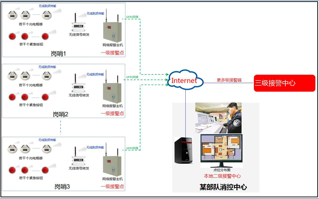 新的時代給人們帶來了富足舒適的生活,同時帶來各種新的問題。部隊是保家衛國的根本。部隊營區的范圍廣,保密度高。部隊崗哨的安防是重中之重。崗哨是第一發現險情的區域,一般崗哨是兩個戰士一班值崗,如果有險情發生,就需要通過報警設備通知到中控室。當前報警系統大致可分為兩類:簡單的報警系統,即主要由前端探測器、探測信號傳輸和報警主機三部分組成,該類系統技術已非常成熟,應用得已很普及。而傳統的大型聯網報警系統,則將探測器和報警主機合并看成是前端部分,從報警主機到接處警之間稱作為傳輸部分,而接處警中心被稱為后端管理平臺部分,非常繁瑣復雜。現在,我們向您介紹的是區別于前面兩類,在技術上更加先進,功能上更為完善的新一代聯網報警系統——恒博網絡聯網報警運營平臺。與傳統聯網報警相比,該系統在前端探測部分引進了設計新穎、技術成熟的全無線緊急觸發設備,后端采用“接警管理中心平臺”將崗哨報警信息直接集中管理。這樣的組建方式不僅免去了前期繁瑣的挖溝鋪管、預埋線纜等施工環節,實現今天安裝立馬應用;提高效率,讓崗哨值班戰士更安全。