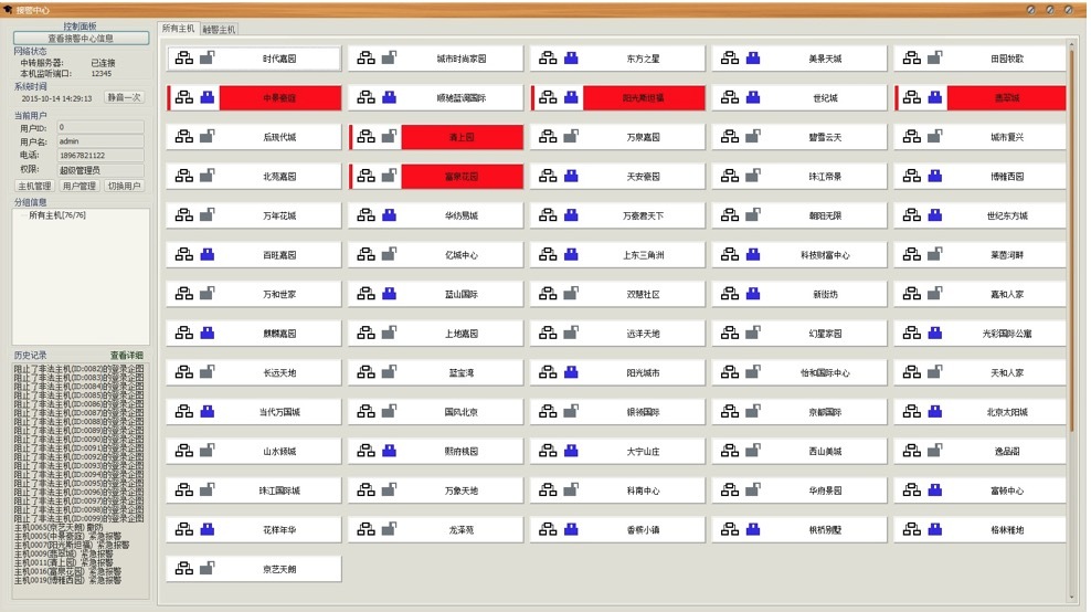 主界面中,每個(gè)按鈕表示一個(gè)“一級(jí)控制主機(jī)”,按鈕文字表示此報(bào)警主機(jī)管理的轄區(qū),可能是一個(gè)小區(qū),一棟商廈,或者一個(gè)廠區(qū)等