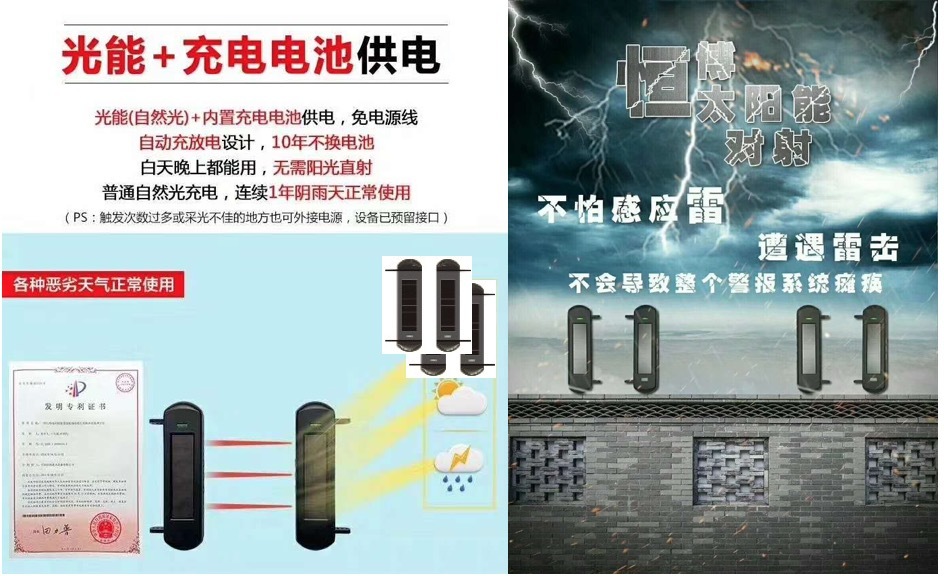 3.防止全系統(tǒng)遭受雷擊。因?yàn)閷?duì)射裝于室外,所以在夏季遭受雷擊的可能性比較大。太陽(yáng)能全無(wú)線對(duì)射無(wú)金屬線連接,即使單個(gè)太陽(yáng)能全無(wú)線對(duì)射遭受雷擊也只是單個(gè)損壞,不會(huì)影響整個(gè)防盜系統(tǒng)。